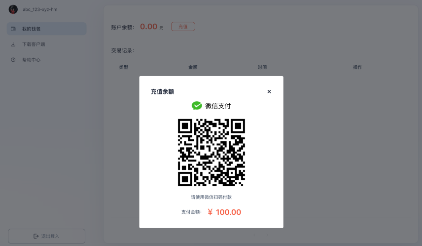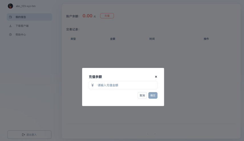 1.点击【充值】按钮,打开“充值余额”弹窗页面: