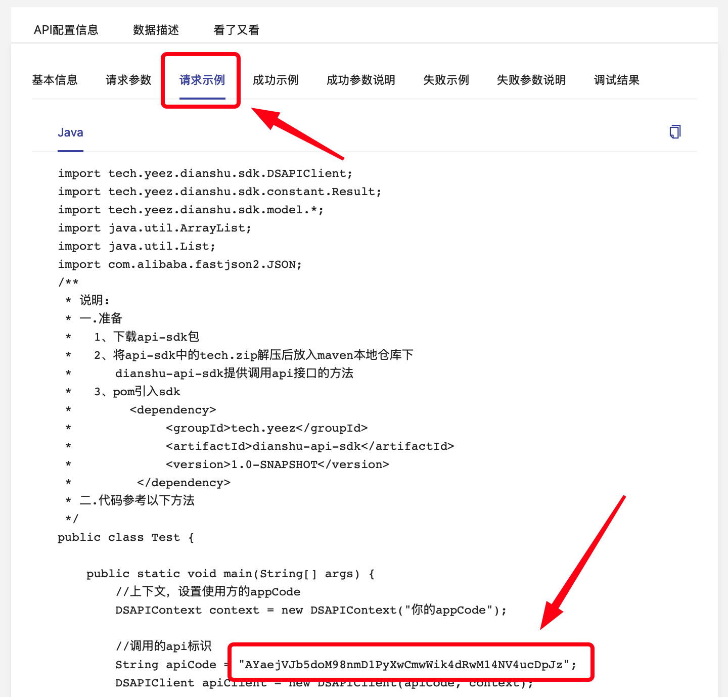 您在调用API接口时,需要使用appCode和apiCode两个参数,您可通过以下方式获取对应参数:
