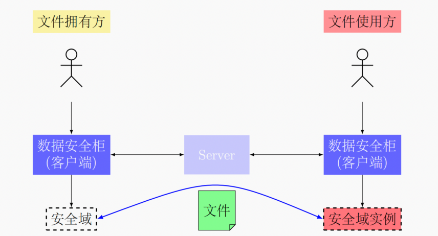 数据拥有方和数据使用方通过本地的数据安全柜客户端进行文件共享操作,数据安全柜客户端通过服务器传输共享文件。