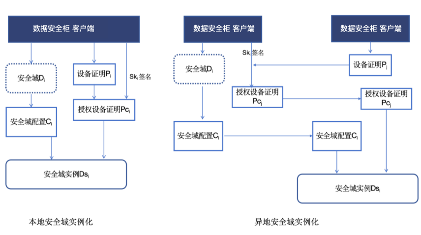 安全域实例化是指数据安全柜客户端基于安全域配置与授权设备证明,在目标设备生成安全域实例的过程。