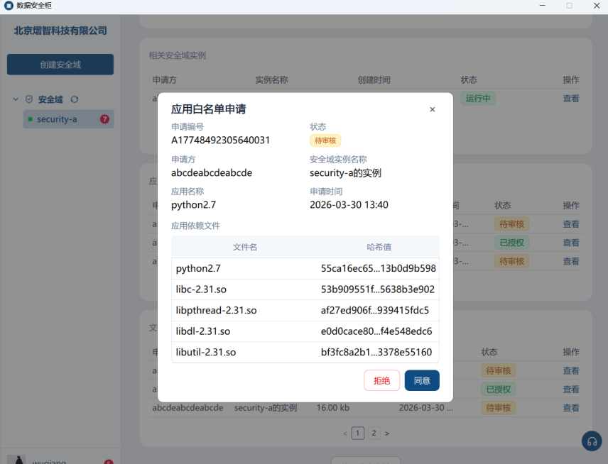 针对安全域实例的使用方发起的对该安全域实例的白名单应用,安全域创建方可以选择同意/拒绝申请。若同意申请,则该白名单即可访问安全域实例。