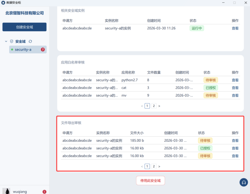 特殊说明:若安全域实例使用方发起的文件导出申请中包含多个文件,将会在列表中拆分为多个记录进行展示,以便安全域创建方针对不同文件进行不同的审批操作。