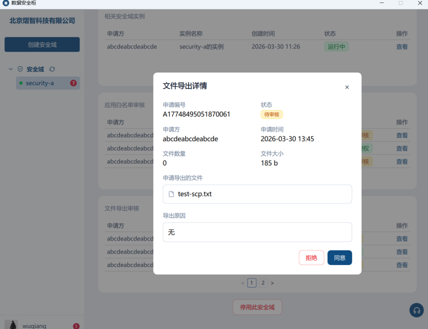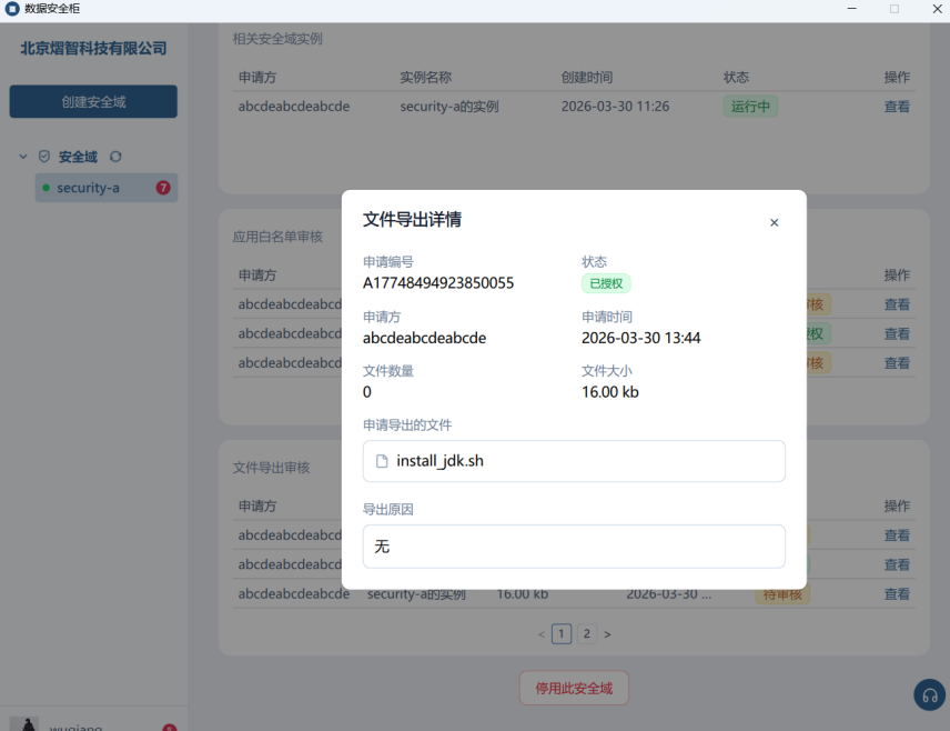 若需将安全域实例中的数据文件导出至实例外,可向安全域的创建方发起申请,申请通过后即可进行导出操作。