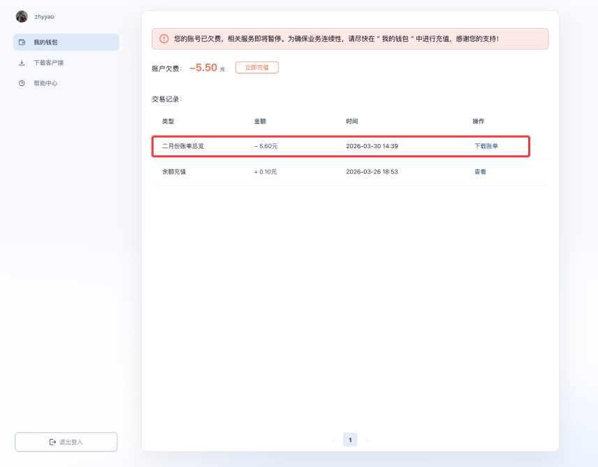 (1)扣费失败处理:若扣费时您的钱包余额不足以支付当月总费用,则系统会进行全额扣款:按实际核算金额进行自动扣费,您的钱包余额变为负值(即欠费状态)。例如:当月费用 500 元,钱包余额 200 元->扣费后余额为-300 元)