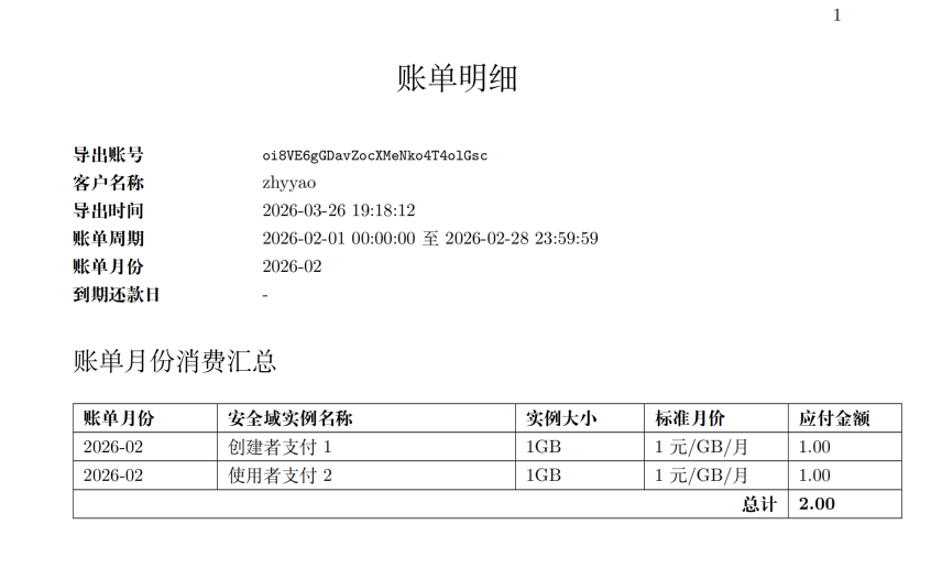 所有需当前账号支付的安全域实例费用账单,将统一汇总至“我的账单”中。系统将在每个自然月 3 日自动扣费,结算上个自然月产生的费用。