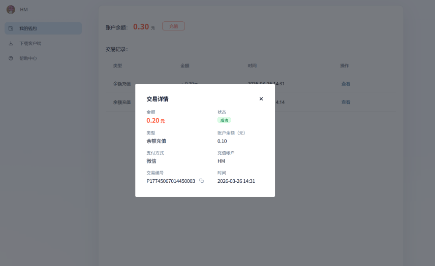 步骤一:点击【充值】按钮,打开“充值余额”弹窗页面: