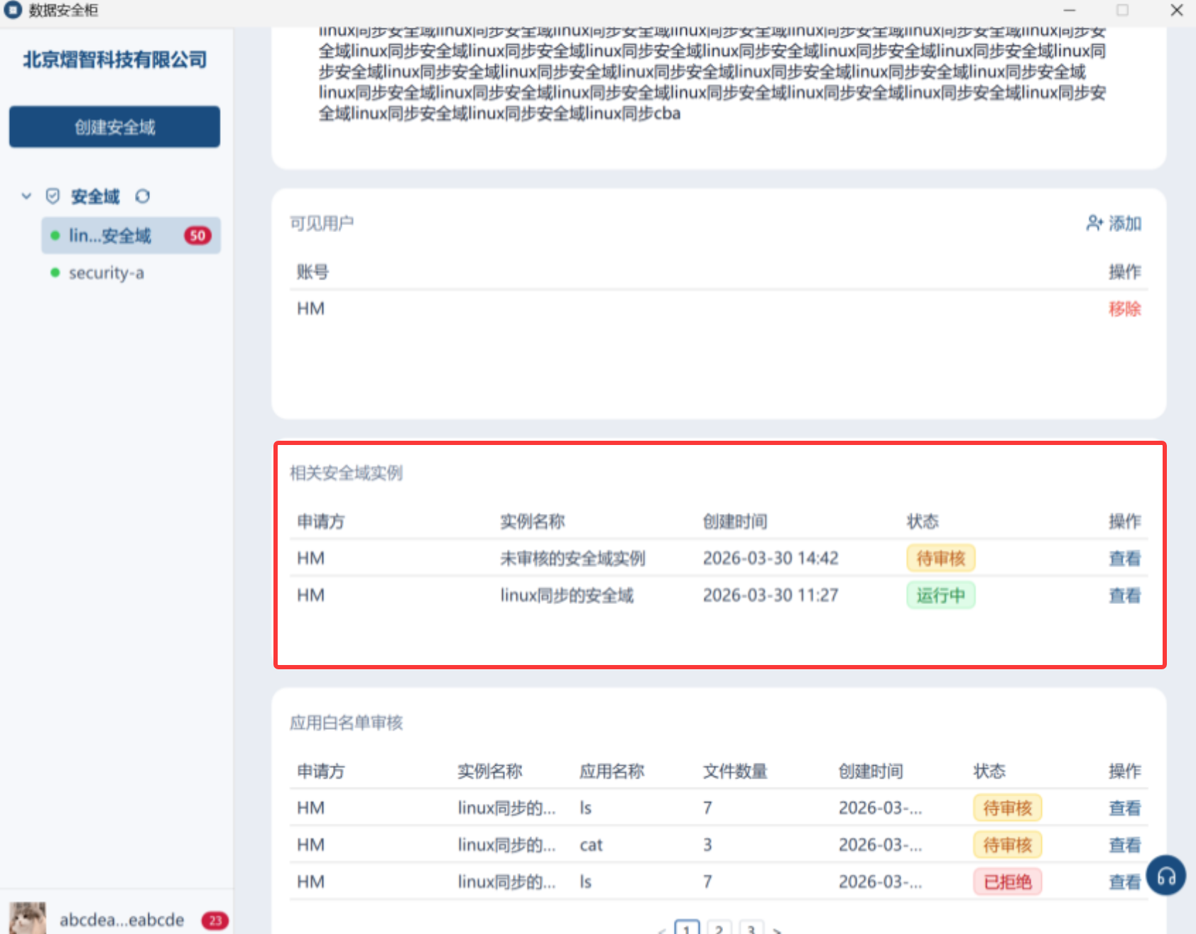 1.安全域创建方可在安全域实例列表中统一管理所有实例申请,包括查看申请详情以及进行审批操作。 2.点击操作列“查看”按钮查看安全域实例申请弹窗页面 3.审批操作: 针对安全域可见用户发起的安全域实例申请,安全域创建方可以选择同意/拒绝申请。若同意申请,则安全域实例申请方即可运行安全域实例并使用。